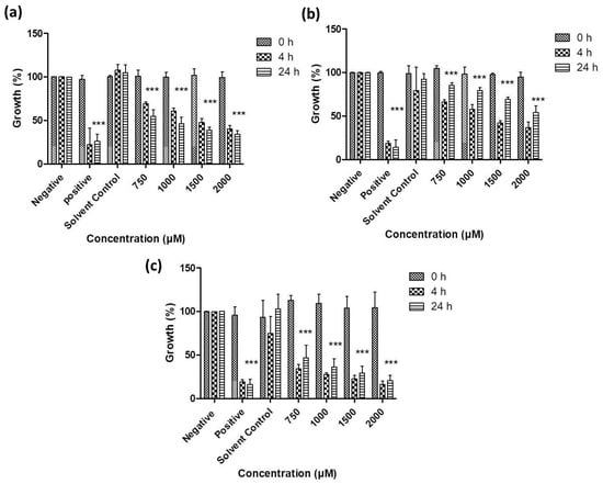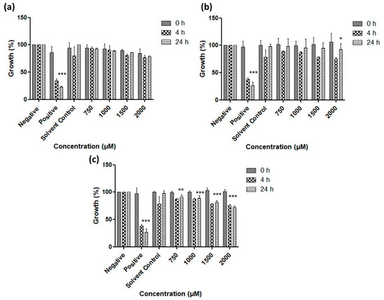 Impact of lyophilized nanosized particles of (a) sulfur, (b) selenium and (c) tellurium on the growth of S. carnosus. Values represent mean ± S.D. *** p < 0.001. See text for further details.