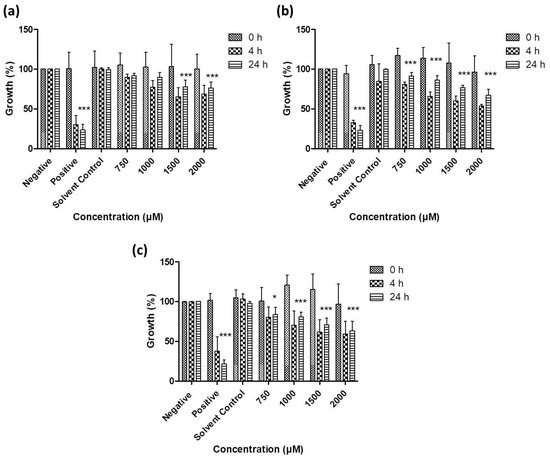 Impact of resuspended nanosized particles of (a) sulfur (b) selenium and (c) tellurium, on the growth of C. albicans. Values represent mean ± S.D. * p < 0.05 and *** p < 0.001. See text for further details.