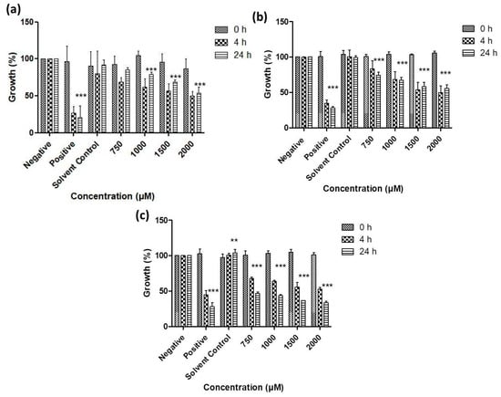 Impact of resuspended nanosized particles of (a) sulfur, (b) selenium and (c) tellurium on the growth of E. coli. Values represent mean ± S.D. ** p < 0.01 and *** p < 0.001. See text for further details.