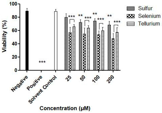 10 µL of nematode suspension were added to each well of a 96-well plate. Suspensions of the nanosized samples (sulfur, selenium and tellurium) were then added into the wells to achieve final concentrations of 25, 50, 100 and 200 µM. Afterwards, the final volume in each well was adjusted to 100 µL by adding Phosphate Buffered Saline (PBS pH = 7.4). PBS and ethanol (10 µL per well) were used as negative and positive control, respectively. Each experiment was performed independently on three different occasions and in triplicate (n = 9). Living and dead nematodes were counted under the microscope prior to treatment, and the viability fraction (V0) was calculated (usually > 0.9). After 24 h, the V24 fraction was calculated by once more counting the living and dead nematodes. 50 µL of lukewarm water (50 °C) was added to each well to stimulate the nematodes prior to counting. After 24 h, the viability was calculated and expressed as a percentage of initial viability V0 according to Equation (1):