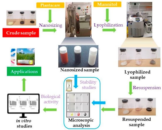Eventually, the stabilizers employed in this study are well established in the literature along with other sugars [20]. Hence future studies may investigate the use of such agents in more detail and also consider alternatives. Trehalose, for instance, could possibly decrease the amount of cyroprotectant used, yet trehalose may complicate the composition and activity of the samples and is more expensive than common sugars, an economic aspect which may need to be considered as part of any practical application [20]. Notably, certain sugars may also serve as nutrients, and this may be counterproductive in the context of antimicrobial activity. It is, therefore, worthwhile to investigate alternative stabilizers which may be either more effective, less problematic and perhaps also more readily available. It may even be possible to identify “two-in-one” agents able to substitute simultaneously for both stabilizers, Plantacare® and mannitol, or to venture into agents which are “waste” or themselves biologically active for the additional “kick” [33]. In any case, the NaLyRe sequence represents a major improvement in the production and handling of otherwise insoluble or sparingly soluble materials and, indeed, one may now consider possible medical and agricultural applications in earnest.