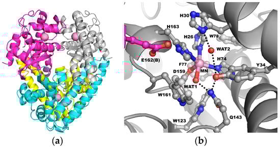 Human MnSOD functions as a homotetramer, with each subunit containing an active site surrounding a manganese ion (Figure 1a). The metal is coordinated by His26, His74, His163, Asp159, and a single oxygen-containing molecule (denoted WAT1), thought to be either H2O or OH− (Figure 1b) []. These amino acids and ligands, termed the “inner sphere” residues, form a direct interaction with the manganese. The next layer of contacting amino acids, called the “outer sphere” residues, are essential for efficient dismutation. These are His30, Tyr34, Phe77, Trp78, Trp123, Gln143, Trp161, and from across the dimer interface, Glu162 [,,,,,]. Each of these residues plays a role in catalysis.