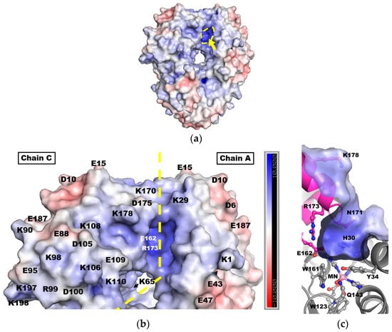 Electrostatic surfaces of human MnSOD. (a) The electrostatic surface of the tetramer with only one active site viewed in this orientation (yellow arrow and dashed lines). (b) A zoomed-in view of the dimer interface indicated by a yellow, dashed line. The labels for Glu162 and Arg173 are white to indicate their location on the concave surface within the active site pit. (c) A cross section-view of the active site across the dimer interface, rotated 90° along the horizontal axis in relation to (a,b). Glu162 is behind Arg173 in this view. Electrostatic surface is colored in kiloteslas. Adapted from Azadmanesh et al., 2017 []. Single letter amino acid code is used.