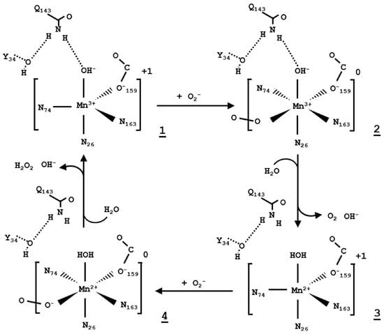 The metal-bound solvent molecule, WAT1, is probably a redox-linked proton accepter and perhaps the most studied component of the network [,,]. QM/MM and DFT calculations indicate that in the Mn3+ state, the solvent ligand is hydroxide (OH−), with its ionization stabilized by the electrostatic interaction with Mn3+. Upon conversion to the Mn2+ state, the solvent ligand is protonated to H2O, counterbalancing the changes in the metal charge (Figure 3). The second half reaction regenerates the Mn3+–OH− state, with the proton from the solvent ligand likely reducing superoxide to hydroperoxyl ion (HO2−), which accounts for one of the two protons needed for conversion to H2O2. The source of the second proton to convert HO2− to H2O2 is poorly understood and is hypothesized to come from His30, WAT2, Tyr34, or bulk solvent [,]. Protonation and deprotonation of the solvent ligand likely happens when a superoxide is bound at the active site (not necessarily directly to the manganese) as this makes product disassociation exergonic and enhances product formation []. These theoretical studies attempt to clarify the source of the two protons during the enzymatic reaction of MnSOD.