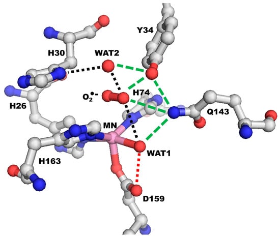 A superoxide-dependent proton shuttling network is thought to exist because superoxide binding to the active site allows different hydrogen-bonding and more energetically favorable conditions for proton transfers [,] (Figure 5). Such a pathway, His30–WAT2–O2•−–WAT1 or His30–O2•−–WAT1, could involve superoxide binding at the active site either directly to the manganese or by non-covalent interactions with Tyr34, Gln143, WAT2, and/or WAT1. QM/MM calculations by Srnec and colleagues suggest that superoxide binding differs between half-reactions, with superoxide directly binding to the manganese in the oxidized state but not in the reduced state []. These results are supported by NMR experiments which observe substrate-analog binding to the metal of FeSOD only in the oxidized state []. These investigations indicate that superoxide binding to the active site forms an alternative hydrogen-bond network that allows for exergonic proton shuttling.
