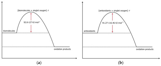 From the above ranges it is concluded that independently of the nature of the antioxidant (anthocyanin, beta-carotene, curcumin, lycopene, polyphenols, sulforafane, vitamin C, etc.) or the kind of process that is taking place, (thermal treatment, pH effect, with presence or without the presence of light, oxygen reaction, etc.), the values of Eact, ΔH≠ and ΔS≠ cover a broad range, whereas the ΔG≠ values cover a narrow range. In this narrow range a value of 10–30 kJmol−1 is needed for the diffusion of the reactants, depending on the reaction and the medium. So, it remains a value of 92 kJmol−1. This value of 92 kJmol−1 is equal to the energy needed for the oxygen molecule, O2, to go from the ground state to the first excited state, the 1Δg state, the singlet oxygen state (see above Section 1.2).