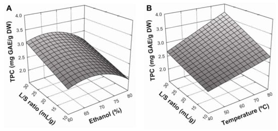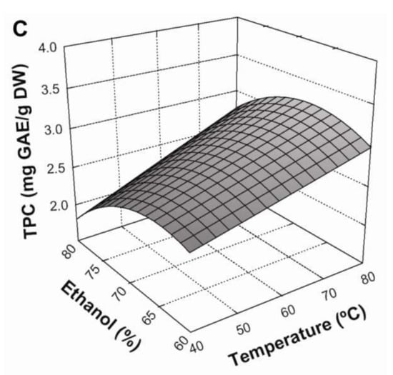The corresponding coefficients of determination (R2) of the models were 0.9701, and 0.9864 for TPC and antioxidant activity, respectively. These values showed that more than 97.01% of the total variation in the response was explained by the models. Additionally, the very low p-values (<0.0001) in each evaluated response indicated the significance of the model terms. In addition, the non-significant value of lack of fit (p > 0.05) showed that the models could be used to predict the results. Finally, response surface plots were established using the fitted models in order to determine the optimal levels of the evaluated variables on extraction of phenolic compounds and antioxidant activity.