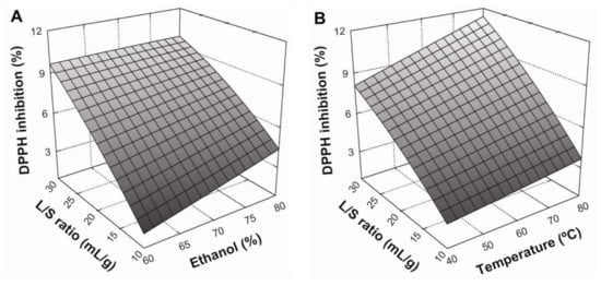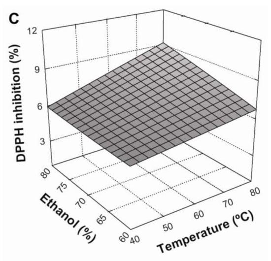 According to Equation (9) (Table 5), the liquid/solid ratio was the variable that had the greatest effect (p < 0.05) on DPPH radical scavenging of extracts. This was followed by temperature, which had a lesser impact. The influence of extraction parameters on DPPH radical scavenging is shown in Figure 2. Similarly to TPC, DPPH inhibition increased when the L/S ratio increased from 10:1 to 30:1 mL/g and temperature increased from 40 to 80 °C (Figure 2A,B, respectively). Furthermore, the interaction between these variables was significant (p < 0.05), with positive effects on DPPH radical scavenging (Figure 2B). Regarding the solvent effect, Figure 2C shows that an increase in ethanol concentration from 60 to 80% produced a positive, linear effect on antioxidant activity. Similarly, the interaction between the solvent system and temperature also produced a positive and statistically-significant (p < 0.05) effect. According to these results, maximum DPPH radical scavenging in BE was be achieved under the following conditions: an L/S ratio of 30:1 mL/g at 80 °C, using 80% ethanol as a solvent system.