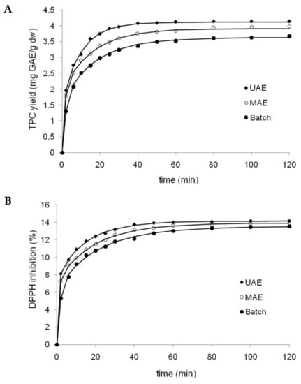 Extraction under optimized conditions was performed for a batch system (BE) as well as for assisted processes using ultrasound (UAE) and microwaves (MAE), in order to determine the influence of each extraction method on the yield of phenolic compounds (Figure 3A), and the evolution of extract antioxidant capacity versus time (Figure 3B). Both figures showed a clear, positive effect of assistance techniques, however this was more pronounced for ultrasound assistance than microwave assistance. The mean comparison by Tukey’s test showed significant differences (p < 0.05) among the three extraction techniques from 10 to 50 min of extraction for TPC yields. In addition, the kinetics of each extraction method for both responses were fitted to the three equation models presented in Table 2. The corresponding results of nonlinear regression and statistical parameters for BA, UAE and MAE fitted by all three models are shown in Table 6. For both responses, Patricelli’s model was the most accurate fit, with the highest coefficient of determination and adjusted coefficient of determination, and the lowest root mean squared error (RMSE) and percentage average absolute relative deviation (%AARD), compared to Peleg and Page models.