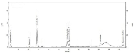An Agilent HPLC 1100 series was used to analyze phloroglucinol adducts according to the method described by Kennedy and Jones (2001) []. The column was a Phenomenex Luna C18 (5 µm, 250 × 4.60 mm), protected by a C18 column guard. The column temperature was 25 °C and the running time for each injection was 42 min. Two mobile phases (A and B, containing 2% v/v aqueous acetic acid and 2% v/v acetic acid in methanol, respectively) were used and the eluting peaks were monitored at 280 nm. The flow rate was set at 0.8 mL/min, with the mobile phase set initially as 95% mobile phase A/5% mobile phase B for 5 min, followed by 90% mobile phase A/10% mobile phase B for 25 min, then 60% mobile phase A/40% mobile phase B for 30 s, and finally, 100% mobile phase B for 6 min, before equilibrating the column to the initial running conditions. To construct the standard curve, solutions A (1000 ppm catechin solution) and B (1000 ppm epicatechin solution) were made and used at concentrations of 0 to 100 ppm. The standard samples were processed as described above. To estimate the proanthocyanidin adducts, the response factors stated by [] were used. The molar sum of all flavan-3-of monomer and phloroglucinol adducts was divided by the molar sum of all flavan-3-ol monomers to calculate mDP. Figure 1 shows an example of the HPLC chromatogram obtained in this study.