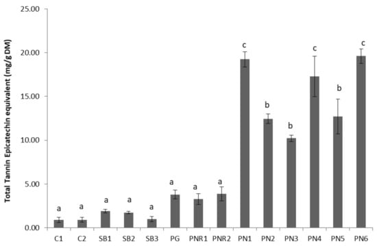 Total tannin content (epicatechin equivalent/g FDM) of different wine lees extracts. Treatments which do not share a letter (a–c) are significantly different (p < 0.05). Error bars are the standard deviation of replicate analysis.