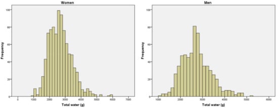 The frequency distribution of total water intake (TWI) showed an average of 2.7 L for both men and women (Figure 1).