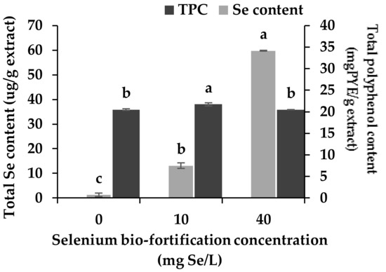 Total selenium (Se) content (µg/g extract) (left axis) and total polyphenol content (right axis) of ricegrass juice extract after being bio-fortified with various concentrations of sodium selenite (0, 10 and 40 mg Se/L) during plantation. Each treatment was tested in triplicate. Data are means ± standard deviation (SD). Different letters indicated significant differences (p < 0.05) in Duncan’s significant differences test. PYE: pyrogallol equivalent.