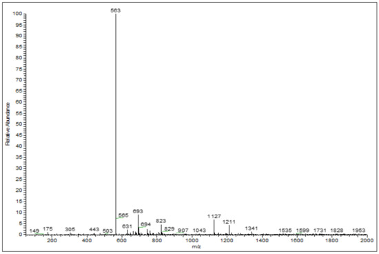 Figure 2 presents the reversed-phase UHPLC-DAD chromatogram of ricegrass juice extract cultivar Chainat 1 obtained using the suitable gradient elution program. In total, 11 compounds were tentatively identified through the ESI-MS in negative mode considering the UV and MS spectral data. Data concerning the identification of the peaks are shown in Table 1, where the retention time, molecular weight and electrospray ionization mass spectrometry of all the compounds detected are also reported. Peak 1 was observed to represent a base molecular anion at m/z 191, thus it was identified as quinic acid. Peaks 3 and 4 were identified as phenolic glycosides according to the m/z of base ions at 315 and 385 resembling the spectrum of protocatechuic glucoside and 1-o-sinapoyl-β-d-glucose, respectively. The ion found at the retention time 23.87 min (peak 5), with the m/z of 367, presented a fragment at m/z 193 which resembles the m/z of the ferulic acid fragment. Thus, this compound was consistent with 3-o-feruloyl-quinic acid. The large group of secondary metabolite compounds in the leaves of Oryza sativa have been reported earlier to be flavone glycosides [26]. The spectra of peaks 6–9 showed a similar base peak of 563 which resembles the spectrum of chrysoeriol arabinosyl arabinoside derivatives. This compound has been formerly found in the literature investigating the compounds in rice leaves using MS/MS with the same m/z recorded [27]. Peak 7 was recognized as the main compound in ricegrass juice extract. The ESI-MS on negative ion of this peak is presented in Figure 3. Peaks 2, 10 and 11 were the group of compounds which also tentatively identified as flavone glycosides referred to the literature. The m/z of 325, 445, 491 were detected and they were identified as tricin, swertisin, and tricin-7-o-β-d-glucopyranoside, respectively, which are the compounds existing in the leaves of rice and wheat [27,28,29].