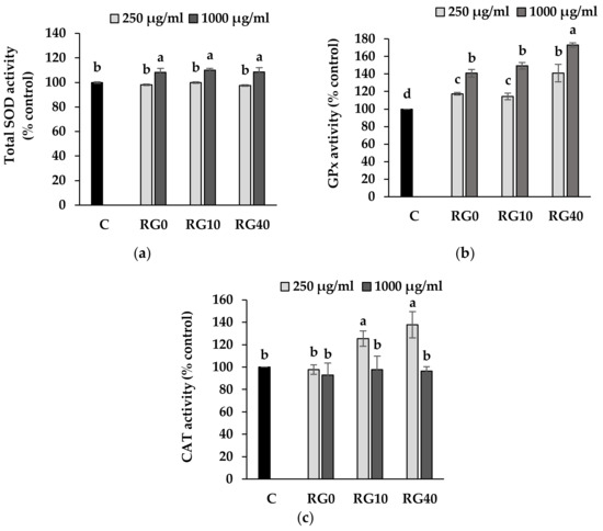 Level of SOD (a), GPx (b), and CAT (c) in RAW264.7 cell line treated with RG0, RG10, and RG40 compare to control. RG0; ricegrass juice extract (control), RG10; ricegrass juice fortified with 10 mg Se/L extract, RG40; ricegrass juice fortified with 40 mg Se/L extract. Data are means ± standard deviation (SD). Different letters indicated significant differences (p < 0.05) in Duncan’s significant differences test.