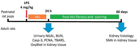The animal protocols used in this work were evaluated and approved by the institutional animal ethics committee (Protocol 9/17 from 28 April 2017) in accordance with Federation for Laboratory Animal Science Associations (FELASA) guidelines. The experiments were performed on outbred white rats. Dams and their pups were kept in cages with a temperature-controlled environment (23 ± 2 °C) with light on from 9 a.m. to 9 p.m. Dams had ad libitum access to food and water, and pups were checked daily for health. The number of pups in a litter was 9–12. Endotoxin-mediated AKI was performed on 3-days-old neonatal and adult rats by intraperitoneal administration of LPS from E. coli (0127:B8 strain, Sigma Aldrich, St. Louis, MO, USA) in concentration 4 mg/kg; the control group was administrated with saline infusion. The total number of animals in each group was 6 (from different litters). The experimental design is presented in Figure 1. Briefly, 24 h after LPS administration, blood, urine and kidneys were taken from animals. Urine samples were diluted 1:1 with 2× sample buffer and boiled for 5 min and then centrifuged at 12,000× g for 3 min. Blood samples were taken to determine blood urea nitrogen (BUN) using AU480 Chemistry System (Beckman Coulter, Brea, CA, USA).