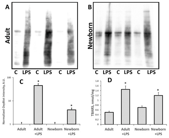 We analyzed the development of oxidative stress and accumulation of oxidative modified (carbonylated) proteins and lipids (TBARS) in 3-days-old neonates and adult rats (Figure 2). After 24 h of LPS administration, we observed much higher levels of carbonylated proteins in both adult and neonatal rats compared to the relevant control. However, in neonatal AKI kidneys this increase was smaller compared to the adult AKI group. While in adult kidneys, the signal of OxyBlot was about 20 times higher after LPS treatment, the same signal rose only about two times in neonatal kidneys (Figure 2C). Note that while adult rats demonstrated a higher increase in carbonylated proteins level, the intact neonatal kidneys initially had a slightly higher Oxyblot signal than the intact adult kidneys. Our results indicate that oxidative stress during LPS-induced, sepsis-like kidney injury is more severe in adults than in neonates.
