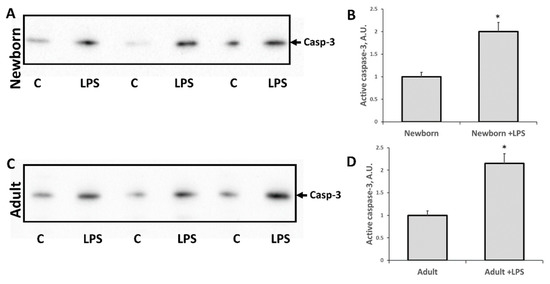Induction of apoptosis in neonatal and adult kidneys 24 h after LPS treatment. Immunoblots for cleaved procaspase-3 (caspase-3, i.e., mature, active form) levels in kidneys of (A,B) neonatal rats and (C,D) adult rats. Densitometry analysis of bands in newborn and adults are presented in (B) and (D), respectively. Number of animals for western blot densitometry: Adult (n = 6), Newborn (n = 6), Adults + LPS (n = 5), Newborn + LPS (n = 5). *: p < 0.05.