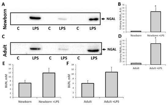 Acute kidney injury in (A,B,E) neonatal rats and (C,D,F) adult rats 24 h after LPS treatment. Significant increase in urinary neutrophil gelatinase-associated lipocalin 2 (NGAL) content and some rise of blood urea nitrogen (BUN) was observed. Diagrams on B, D represent densitometry analysis of corresponding bands on the blots. Number of animals for western blot densitometry: Adult (n = 4), Newborn (n = 4), Adult + LPS (n = 4), Newborn + LPS (n = 4). *: p < 0.05.