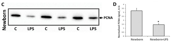 Proliferative activity of kidney cells of newborn and adult rats 24 h after LPS treatment. Immunoblots for proliferating cell nuclear antigen (PCNA) levels in (A) adult kidneys and (C) neonatal kidneys and their densitometry analysis in (B,D), respectively. Number of animals for western blot densitometry: Adult (n = 6), Newborn (n = 6), Adult + LPS (n = 5), Newborn + LPS (n = 5). *: p < 0.05.