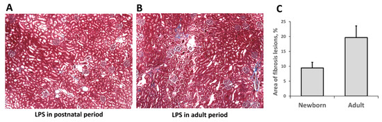 Histological evaluation of fibrotic changes in neonatal and adult kidneys two months after LPS treatment. (A) Kidneys of rats that received LPS in neonatal age and (B) kidney of rats treated with LPS in adult age. (C) Evaluation of fibrotic lesions revealed increased fibrosis in adult group. Number of animals: Adult (n = 3), Newborn (n = 3).