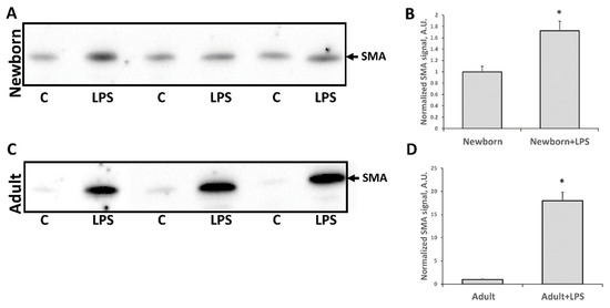 Kidney fibrosis, estimated by α-smooth muscle actin (SMA) levels in kidney tissue two months after LPS treatment. (A,B) Immunoblots of kidneys of rats that received LPS in neonatal age and (C,D) rats treated with LPS in adult age. (B,D) Densitometry analysis of bands in neonates and adults, respectively. Number of animals for Western blot densitometry: Adult (n = 6), Newborn (n = 6), Adults + LPS (n = 5), Newborn + LPS (n = 5). *: p < 0.05.