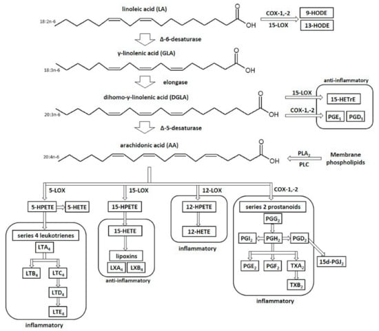 Regardless of the metabolism of DGLA catalyzed by COXs and 15-LOX, dihomo-γ-linolenic acid under the influence of Δ-5-desaturase (D5D) is converted to arachidonic acid (AA), which is the precursor of many lipid mediators in the body, mainly pro-inflammatory [18,24]. Under physiological conditions, the sources of AA are membrane phospholipids, from which it is released by the hydrolysis of ester bonds, mainly via the action of phospholipase A2 (PLA2). There are two main ways that lead to the formation of free arachidonic acid. One pathway leads to the hydrolytic release of AA by the cytosolic isoform of PLA2. The second way leads to the release of AA by the indirect action of phospholipase C (PLC) and diacylglycerol (DAG) lipase. DAG lipase and PLC result in the formation of inositol 1,4,5-triphosphate and DAG. The latter is then hydrolyzed by DAG lipase to form free arachidonic acid and monoacylglycerol (MAG) [18,30].