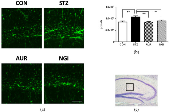 Hyperglycemia induces inflammation and oxidative stress in the brain [7,8], and excess glial cell activation is known to be responsible for oxidative stress and inflammatory reactions in the brain [17]. Micoglia (Iba1-positive cells) activation were not confirmed in all groups (Figure 2a,b); however, the number of reactive astrocytes that is immunostained with the GFAP antibody significantly increased in the stratum lacunosum-moleculare in the hippocampus of the STZ group (Figure 3a,b; ** p < 0.01). In contrast, the GFAP-positive signals were significantly suppressed in the AUR and NGI groups (Figure 3a,b; ## p < 0.01, ### p < 0.001).