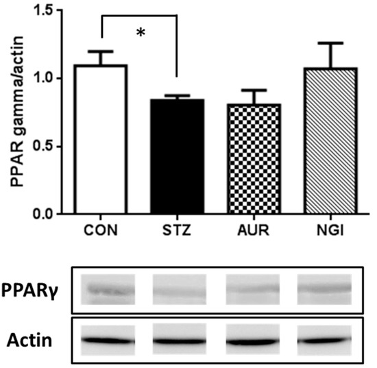 PPARγ regulates the cell signaling of the inflammation process and exerts anti-inflammatory effects [18], and the expression of PPARγ in the hippocampus was significantly suppressed in the STZ group (Figure 4; * p < 0.05); however, no significant changes were observed in the AUR and NGI groups.