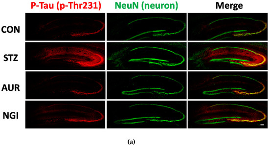Tau, a microtubule-associated cytoskeletal protein, in the neuron has been understanding to relate to the molecular mechanisms for neurofibrillary tangle (NFT) formation through its multiple phosphorylative and conformational changes. It was previously shown that inflammation and oxidative stress induce tau hyperphosphorylation [19,20], and this was confirmed in STZ-injected mice brain [21]. We evaluated tau phosphorylation levels at 231 of threonine (p-Thr231) and 396 of serine (p-Ser396) in the hippocampus (Figure 5 and Figure 6). Strong positive signals for p-Thr231 were confirmed in the CA3 region pyramidal cell layer and in the stratum lacunosum-moleculare in the hippocampus. The integrated densities of the immune-positive signals were evaluated, and that was significantly higher in the STZ group (Figure 5a,b; ** p < 0.01); however, significant suppressive effects on its phosphorylation was observed in the AUR and NGI treated groups (Figure 5a,b; # p < 0.05). Similar to p-Thr231, the levels of p-Ser396 in the hippocampus were significantly higher in the STZ group than in the CON group (Figure 6a,b; * p < 0.05). The signals were confirmed in hippocampal mossy fibers and the stratum lacunosum-moleculare. On the other hand, the AUR and NGI treatments exerted a tendency of suppressive effects (Figure 6a,b; p = 0.056 and p = 0.087, respectively).
