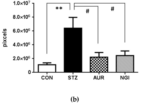 STZ-treated mice showed significantly elevated blood glucose concentrations, whereas suppressive effects were not observed in the NGI and AUR groups (Figure 1). Previous studies reported that the administration of 100 mg/kg of NGI suppressed blood glucose concentrations in STZ-treated rats, or 0.2% of AUR administration resulted in suppressive effects on high-fat diet-induced obese mice, respectively [25,26]. These findings suggested that NGI and AUR have the potential to reduce blood glucose concentrations in several diabetic models. However, treatments with NGI and AUR did not reduce blood glucose concentrations in our experiment.