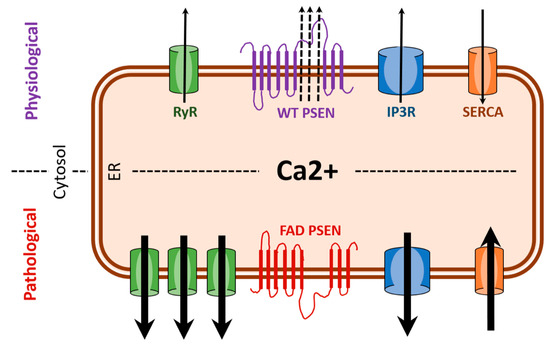 FAD (familial Alzheimer’s disease) presenilin mutations result in enhanced ER (endoplasmic reticulum) calcium release. Under pathological condition associated with FAD, there is excessive ER (calcium release) as a result of overexpression of RYR (ryanodine receptors) and potentiation of IP3R (IP3 receptors). Also, hyperactivity of SERCA (sarco/endoplasmic reticulum calcium ATPase) pumps and the loss of leak channel function of PSEN (presenilin) can increase ER-calcium stores thereby increasing release of calcium via RYR and IP3R. Black arrows indicate direction of calcium movement.