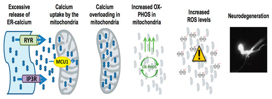 Presenilin mutations result in enhanced ER-mitochondria calcium transfer mediated neurodegeneration. Presenilin mutations result in excessive ER-calcium release, which causes the activation of mitochondrial calcium uniporter MCU-1 (mitochondrial calcium uniporter 1) and subsequent uptake of calcium into the mitochondria. With increased calcium uptake into the mitochondria, it stimulates mitochondrial respiration and increases ROS (reactive oxygen species) generation, resulting in neurodegeneration.