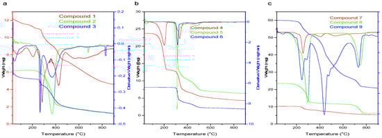 The thermograms of Schiff bases (1–9), obtained from the thermogravimetric analysis at 0 °C to 900 °C under a nitrogen atmosphere at a heating rate of 10 °C/min, are presented in Figure 2a–c. There were changes in thermal responses with substitution.