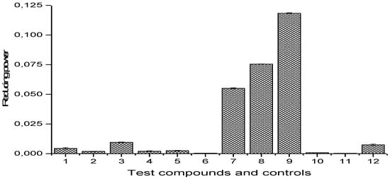 The ferric reducing activity was evaluated according to the method of Oyaizu [], with slight modification. The reduction assay involved addition of 0.5 mL aliquot of compounds (1–12), 2 mL phosphate buffer (0.2 mole/L, pH 6.8) and 2 mL potassium ferricyanide (10 mg/mL). Then, the mixture above was incubated at 318 K for 30 min followed by the introduction of 2 mL of trichloroacetic acid (100 mg/L). Thereafter, a 2-mL portion of the incubated mixtures was transferred into 2 mL of distilled water, and ferric chloride (0.4 mL, 0.1% w/v) and left to stand. After 10 min, the concentration of Fe2+ complex was measured at 700 nm and reported as the reducing power of compounds 1–12.