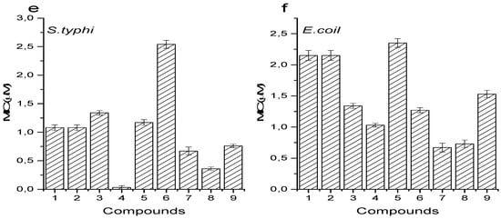 (a–f) Minimum Inhibitory Concentration (µM) of Schiff bases 1–9.