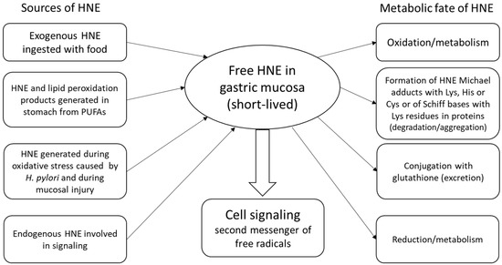 Schematic presentation of major sources of 4-hydroxynonenal (HNE) in gastric mucosa and the ways of its further transformations. Free HNE is a highly reactive molecule, capable of reacting with numerous targets within cells. HNE interfering with redox-sensitive pathways (for example, by binding to cysteine residues) may affect the function of redox-sensitive proteins. Conjugation of HNE with histidine or lysine residues of peptides and proteins are thought to be less important for signaling. However, even in these cases, HNE may bind enzymes, cytokines, and receptors, so they may have important regulatory roles. Hence, such aldehyde-protein adducts can represent a source of HNE and cause secondary oxidative stress, while they can also be used as biomarkers for immunochemical detection of HNE, denoted as advanced lipoxidation end products (ALEs).