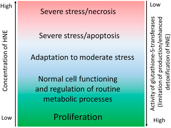 Formation of HNE conjugates with glutathione and adducts with proteins may have heterogeneous consequences for the cells, depending on the role of respective residues. Depletion of reduced glutathione may increase vulnerability of the cells to oxidants and shift the redox balance to the pro-oxidant side. Addition of HNE to cysteine residues may alter function of proteins, and may have significant regulatory consequences, whereas binding to other sites (for example, histidine or lysine residues) may have not much effect on function, and can rather reflect the degree of HNE accumulation and possible oxidative damage [12,29,30] (Figure 2).