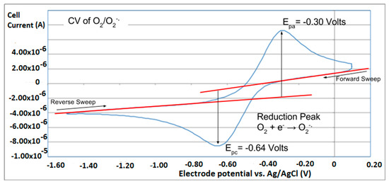 Subsequently, the superoxide radical ion generated at the working electrode can react with reactive species in the solution near the electrode surface. On the “reverse” scan, the remaining superoxide radical ion gives up its electron to the electrode in an anodic reaction. The electrode reaction in both the forward and reverse directions is measured as a current seen as peaks in the CV: