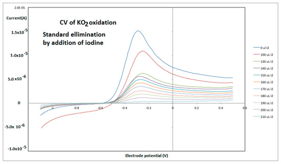 where m is the slope of the calibration curve. The KO2 solution was titrated with standardized iodine using the oxidation peak in the CV.