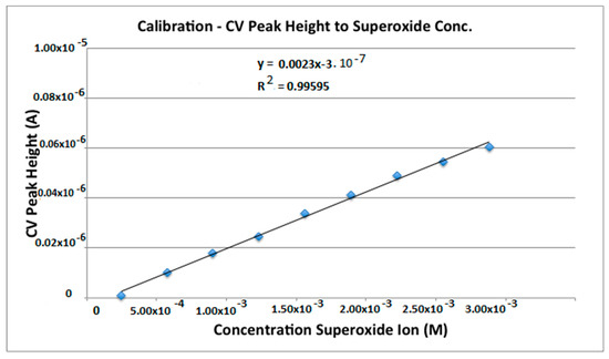 The endpoint of the titration was used to calculate the initial concentration of superoxide in the stock KO2 solution. Next, the amount of superoxide in solution for each of the voltammograms was calculated and the titration curve restated as a calibration curve for the voltammogram as shown in Figure 5. Finally, a linear fit of the plot was performed and an equation obtained.