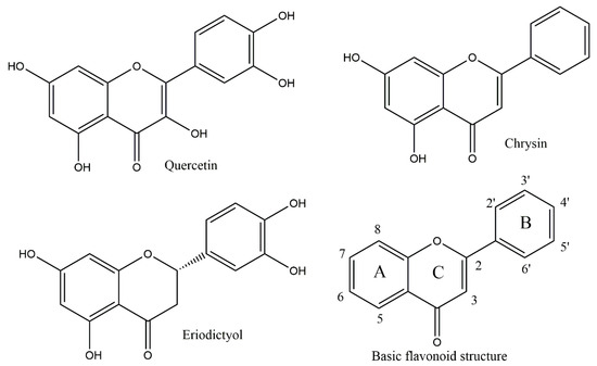 Flavonoids are among the interesting natural compounds having antioxidant activity. Besides this activity, these compounds exhibit numerous advantageous biological properties, such as aids in digestive disorders [12]. The flavone skeleton structure provides ample substitution sites leading to a huge variety of structurally modified compounds. The subtle structural differences of flavonoids caused by hydroxyl and methoxy group substitution patterns in the three ring-system are known to affect their beneficial biological properties [13,14]. In this study we deal with three different flavonoids: quercetin, chrysin and eriodictyol, that are respectively, a flavonol, flavone and flavanone. Many traditional medicinal remedies throughout the world rely on citrus peels and eriodictyol is commonly found in citrus peels, along with related naringenin and hesperitin. Studying the molecular and crystal structure obtained through single-crystal diffraction methods allows us to investigate how these subtle structural changes can influence the biological properties. The crystal structure of eriodictyol was determined and the atomic coordinates employed to describe its reactivity with superoxide using Density Functional Theory (DFT).