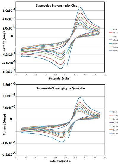 As seen in the Results section, chrysin and quercetin are effective scavengers of superoxide, and their slope can indicate the proficiency of antioxidant scavenging, Figure 8. Yet we can guess some difficulty in accurately quantifying this scavenging action, for instance when comparing more antioxidants, if we want to know which antioxidant is stronger. The uncertainty arises from the fact that measuring distances from the red tangent lines of Figure 1 to the peak maxima can be subjective, also when studying the lines obtained after adding the aliquots. For this reason, a more accurate method would be recommendable. This is provided by the RRDE technique, where the measurement of data is specifically obtained at a given potential at the ring electrode.