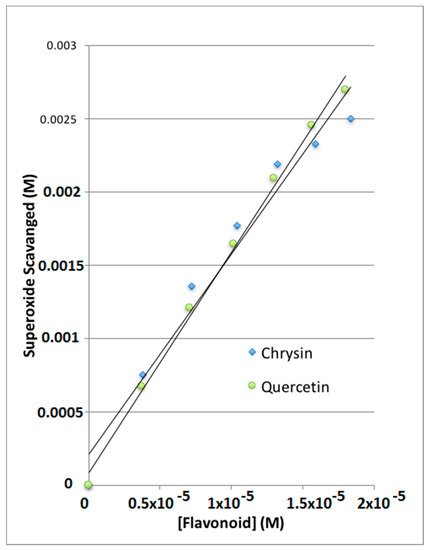The structure-function relationship for flavonoid protection of lipid peroxidation has been described [29]. The flavonoid pharmacophore involves a catechol moiety in ring B and a OH-group at the 3 position with electron donating groups at the 5 and/or 7 position in the AC-rings. Quercetin (with five hydroxyls at 3, 5, 7, 3′, 4′) is an example of a flavone having this molecular arrangement. This finding is in agreement with our experimental results where the quercetin superoxide scavenging is superior to the other two tested compounds. Eriodictyol (5, 7, 3′, 4′ OH and missing the 3-OH group) is next in scavenging potency and chrysin (5, 7 –OH groups) shows the least scavenging activity.