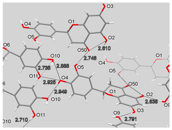 There are numerous hydrogen bonds (eight) in the crystal structure leading to a pattern composed of an infinite array of short interactions; it is shown in Figure 10. A related pattern was described earlier for hesperitin [22] and naringenin [23]. Although the hydrogen bond pattern seen in these molecules shares common features with eriodictyol (this work), none have as widespread and three-dimensional a pattern as eriodictyol. Of those flavanones whose crystallographic structures are available in the Cambridge Structural Database (CSD), hesperitin is most similar to the functional group substitution pattern found in eriodictyol—it only differs by substitution of an ortho methoxy group for a hydroxyl on the attached phenyl ring. However, eriodictyol’s two molecules both have the angle between the phenyl ring and the carbonyl-containing ring at close to 77° while for hesperitin, the planes of the phenyl ring and the carbonyl-containing ring are almost co-planar, about 3°.