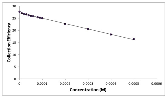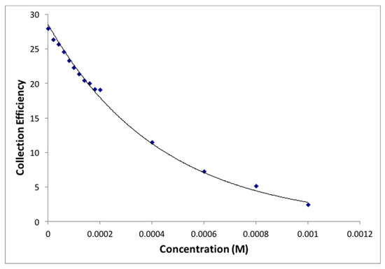 The collection efficiency is obtained from the voltammogram, and Figure 11 shows this amount for eriodictyol, by dividing the I value at the ring and that at the disk for each added aliquot, against the concentration of flavonoid in the solution. Figure 12, Figure 13 and Figure 14 show the results for quercetin, eriodictyol and chrysin and confirm the trend shown in the classical CV study: the more antioxidant added, the less superoxide radical detected, in this case at the ring electrode. The different slopes are indicators of scavenging capabilities for each flavonoid; these are included in Table 2, which also shows the ratio between hydroxyl groups for quercetin/eriodictyol/chrysin (5:4:2). The ratio between eriodictyol and chrysin slopes (4:2) is exactly the same as their hydroxyl ratio, and indeed, the number and location of hydroxyl groups are believed to affect the scavenging ability of antioxidants [14]. In contrast, quercetin activity seems to be higher, e.g., the slope ratio of quercetin/eriodictyol/chrysin = 9.6:4:2 differs from the hydroxyl ratio 5:4:2, Table 2. It is not clear why quercetin scavenges many more superoxide radicals in comparison with eriodictyol and chrysin, nor the reason of the non linear behavior of quercetin in Figure 12, which differs markedly from Figure 13 and Figure 14. Since quercetin possesses the larger number of hydroxyls it may be that a quercetin-specific behavior between partially dehydroxylated quercetin radicals is at work, such as the fusion of 2 radicals generating new species and thus producing the non linear portion of Figure 12. The fact that the excessive scavenging activity of quercetin occurs at low concentration is also intriguing. We conclude that further particulars need to be considered in the RRDE experiment dealing with superoxide radical and antioxidants, including for instance, convection and diffusion phenomena.