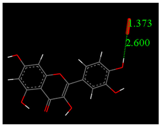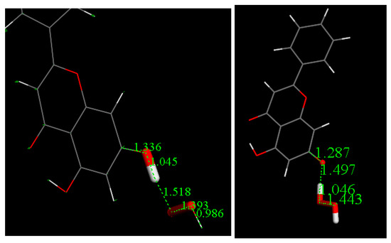 Atomic coordinates from the quercetin crystal structure [25] were used as the starting point in calculations to analyze its scavenging activity towards the superoxide radical. After minimizing the geometry of quercetin and O2−•, both molecules were posed at van der Waals separation, 2.60 Å, for the extraction of H• in position 4′ (Figure 15). For this initial state of reactivity, we performed a geometry optimization and reached the energy minimum, characterized by no imaginary frequencies (Figure 16). We performed a similar task for the product of the reaction, that is, after removing H•(4′) from quercetin, we posed its minimized radical at van der Waals separation from minimized HO2− and the result of the corresponding geometry optimization is depicted in Figure 16. The transition state (TS) was found (Figure 16) and showed, as expected, only one imaginary frequency, −1128 cm−1. DeltaG for this calculation is −1.5 Kcal/mol and the associated barrier is 0.5 Kcal/mol, which indicates reaction feasibility.
