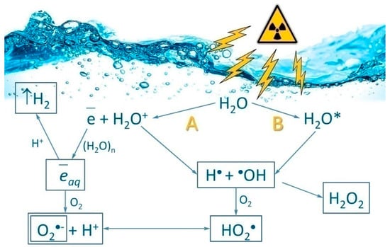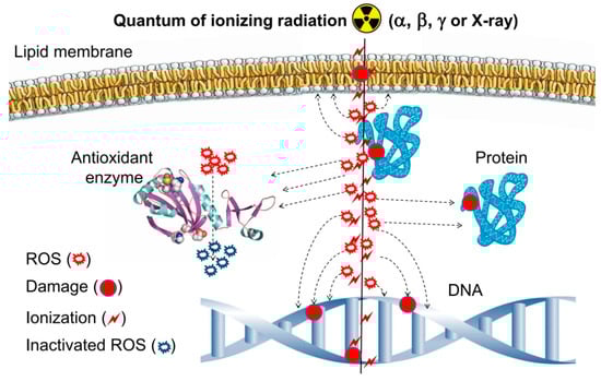 Ionizing radiation is the flow of photons, elementary particles, and nuclear fission fragments capable of ionizing matter. The ionization process is usually defined as the conversion of neutral atoms or molecules into ions and radicals [1]. Ionizing radiation has a direct and indirect influence on living organisms. The direct effect includes damaging biological molecules via immediate contact with a quantum or particle of ionizing radiation. Indirect influence is related to the formation of water radiolysis products in the cell, namely reactive oxygen species (ROS) (Figure 1). The most widely known members of the ROS group are the superoxide anion radical (O2•−), hydroperoxide radical (HO2•), hydrogen peroxide (H2O2), hydroxyl radical (HO•), singlet oxygen (1O2), etc. [2]. Every 100 electron-volts of absorbed ionizing radiation energy generates on average 2.4 HO• radicals, 2.8 solvated electrons, 0.4 hydrogen atoms, 0.8 H2O2 molecules, 0.4 H2 molecules and much less of other compounds [3].