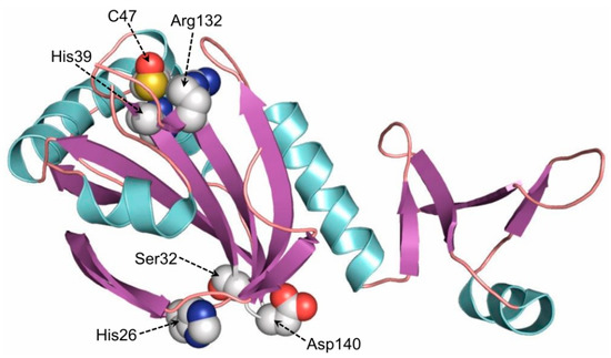 The schematic structure of human Prdx6 (Peroxiredoxin 6). Amino acid residues in the peroxidase catalytic center (His39, Cys47, Arg132) and phospholipase A2 active center (His26, Ser32, Asp140) are shown. The structure was built in Pymol.0.99.