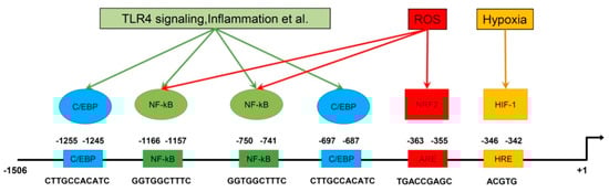 It is worth mentioning that PRDX6 expression is regulated by numerous transcription factors (Figure 4). Factors NRF2, HIF1α and C/EBPβ enhance PRDX6 expression, while NF-kB has a suppressive effect on the expression level of PRDX6. Analysis of the PRDX6 gene promoter showed the presence of binding sites for each of the aforementioned transcription factors [56,57].
